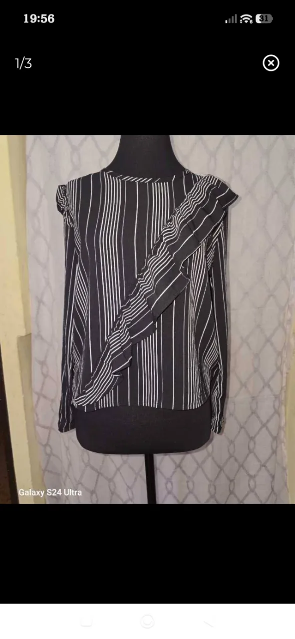Blusa rayada con volados en el hombro y detalle de la misma tela cruzado en el frente. Manga larga y cuello redondo. Ideal para un look canchero y moderno.