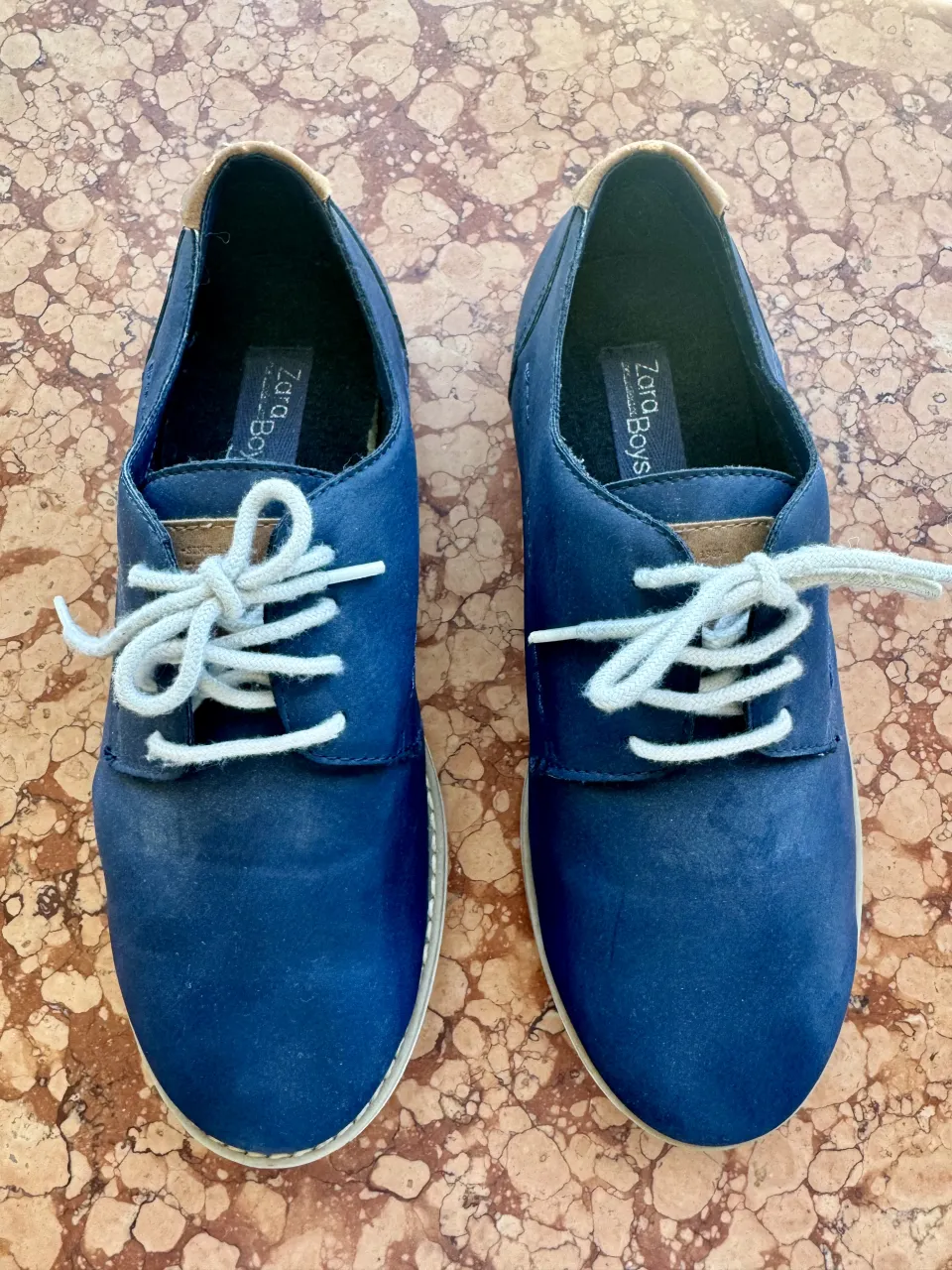 Zapatos náuticos de cuero azul marino, con cordones blancos de algodón y detalles en color suela. muy blanditos y cómodos