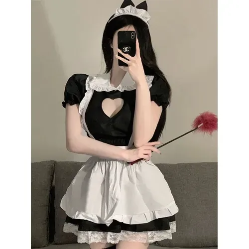 Vestido corto de mucama con delantal blanco, cuello y mangas con volados. Posee un recorte en forma de corazón en el busto. Incluye guantes blancos de regalo 💌