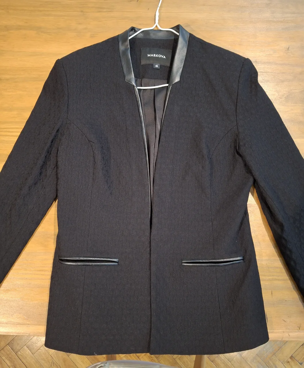 Blazer negro elegante con detalles en cuero sintético. Ideal para un look sofisticado.