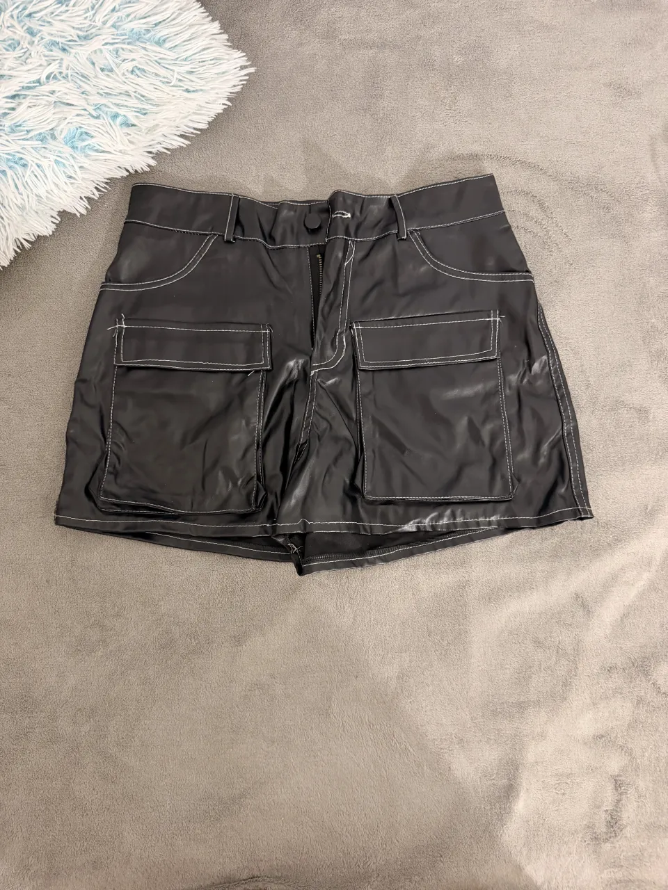 Shorts de cuero sintético negro con pespuntes blancos. Diseño cargo con bolsillos frontales y traseros. Tiro alto, ideales para un look canchero y moderno.