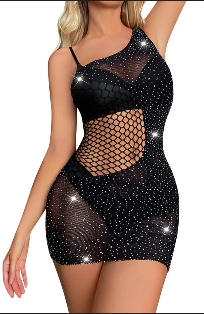 Vestido negro con brillos y detalles de red, ideal para una noche de fiesta o para sentirte sensual. Su diseño audaz y llamativo te hará destacar.