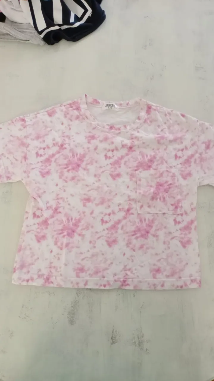 Remera manga corta con estampa tie-dye en tonos rosa y blanco. Tiene un bolsillo en el frente y un corte moderno.
