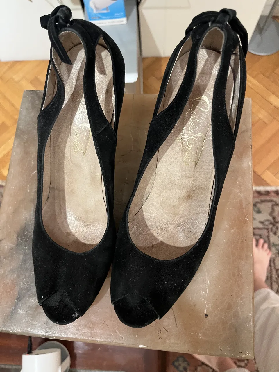 Zapatos de taco alto negros, estilo peep toe, con tiras que se anudan en el tobillo. Ideales para un look elegante y sofisticado.