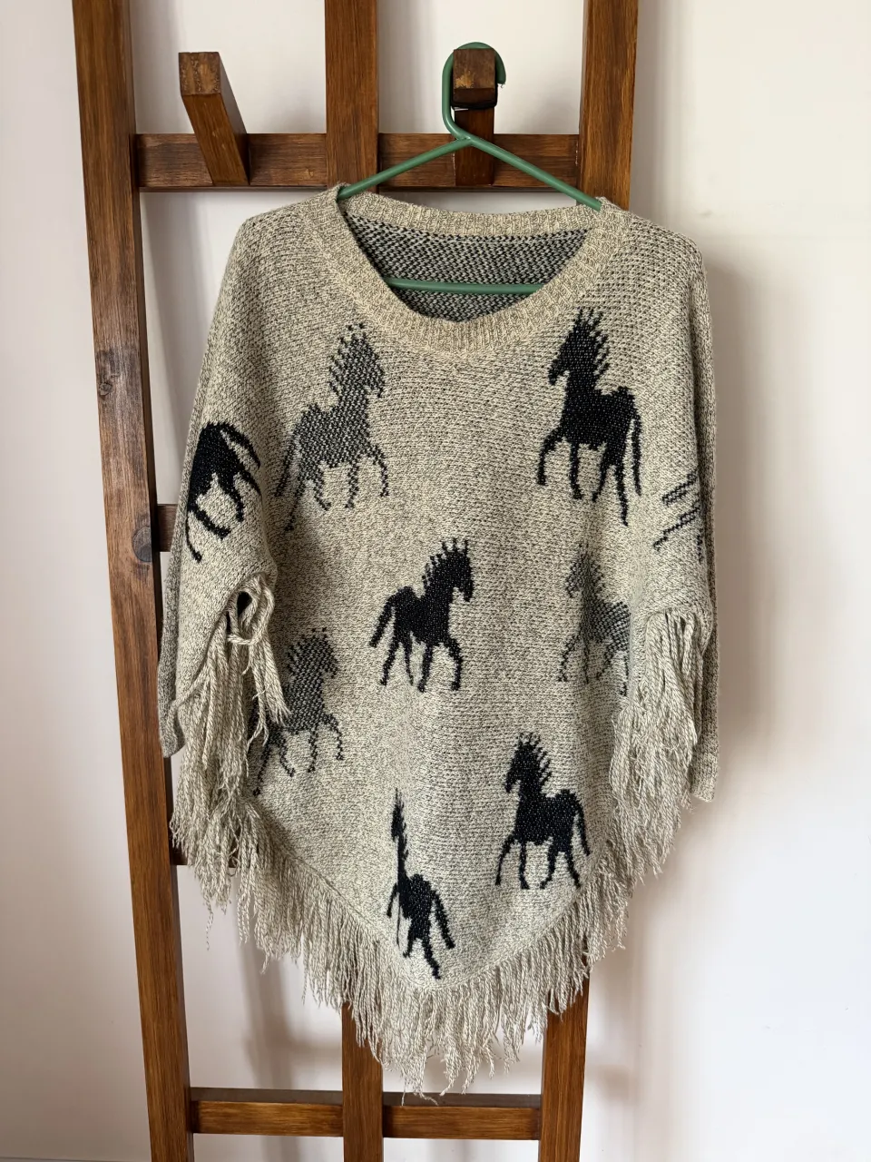 Poncho tejido súper canchero con estampa de caballos en negro. Tiene flecos largos en los bordes, dándole un toque bohemio y moderno. Ideal para usar sobre cualquier outfit y darle un estilo único. Detalle: ver foto