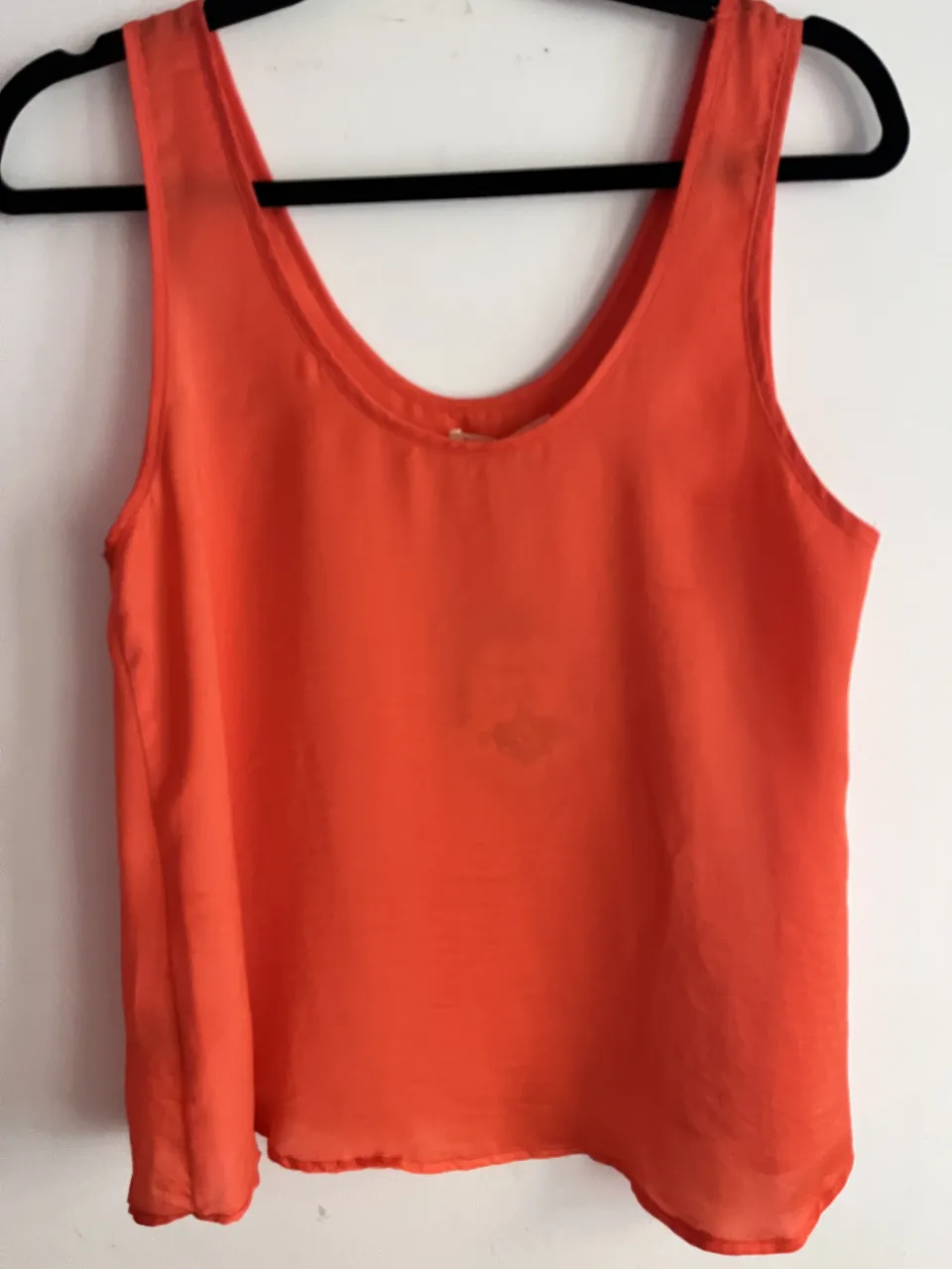 Musculosa naranja con cuello redondo y tiras finas. Tiene una etiqueta de marca "Bendito Pie" y una etiqueta de talle "M".