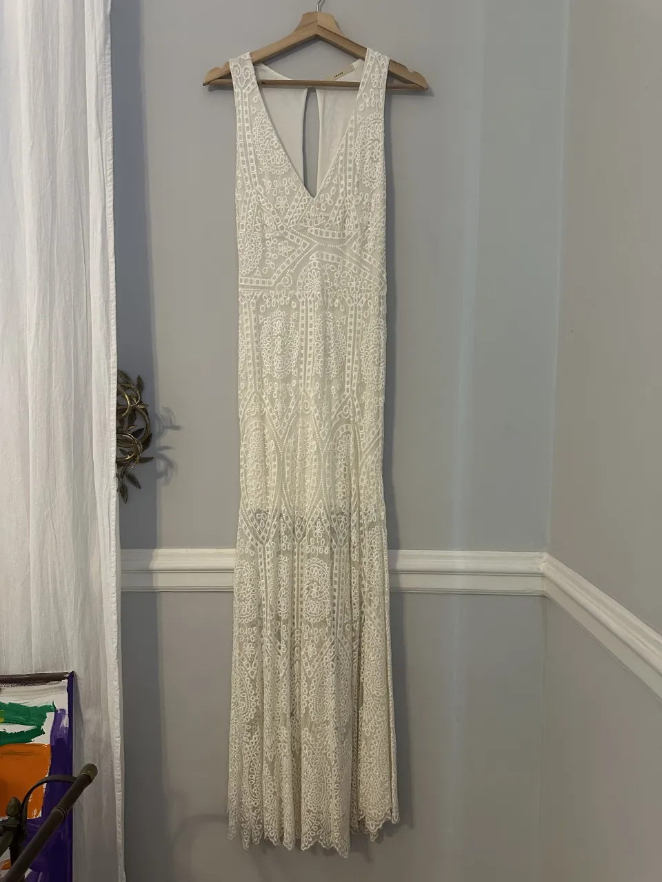 Vestido AWADA largo blanco de encaje, ideal para un casamiento o fiesta de día. Posee un escote en V pronunciado y un corte al cuerpo que se abre en la parte inferior. Tiene forreria al tono. Su diseño delicado y romántico lo hace perfecto para eventos especiales.