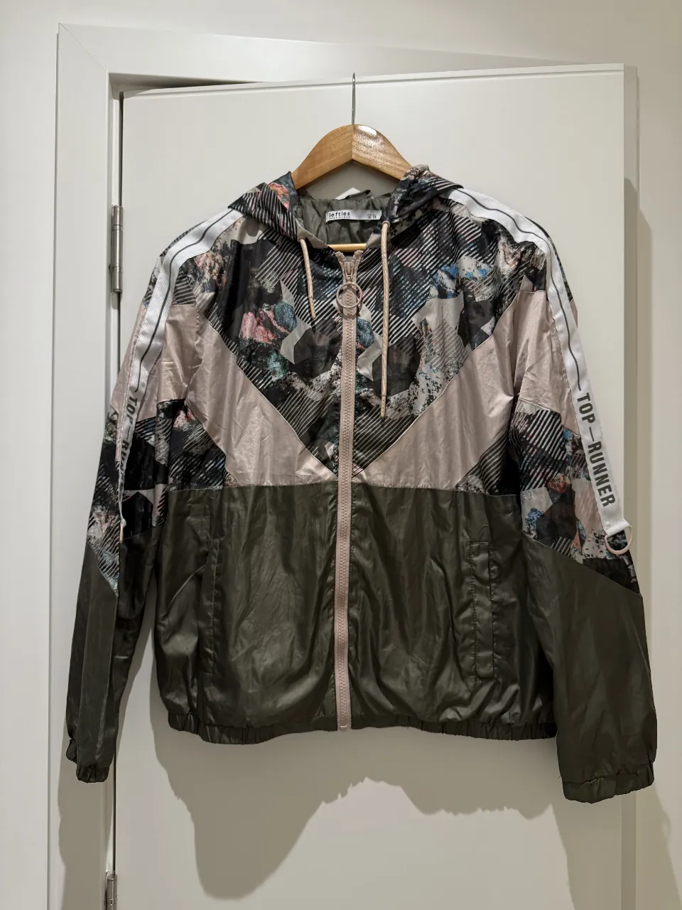 Campera deportiva con capucha, ideal para running o actividades al aire libre. Diseño moderno y colorido con detalles estampados y franjas en las mangas. Cierre frontal y cordones ajustables en la capucha.