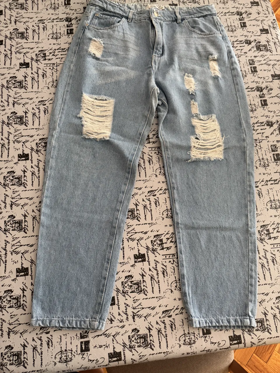 Jean de tiro alto con roturas y desgastes en la parte delantera. Posee bolsillos frontales y traseros.