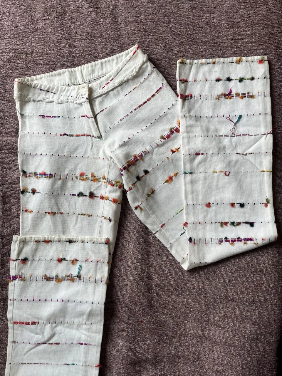 Pantalón blanco con detalles de hilos de colores en líneas horizontales.