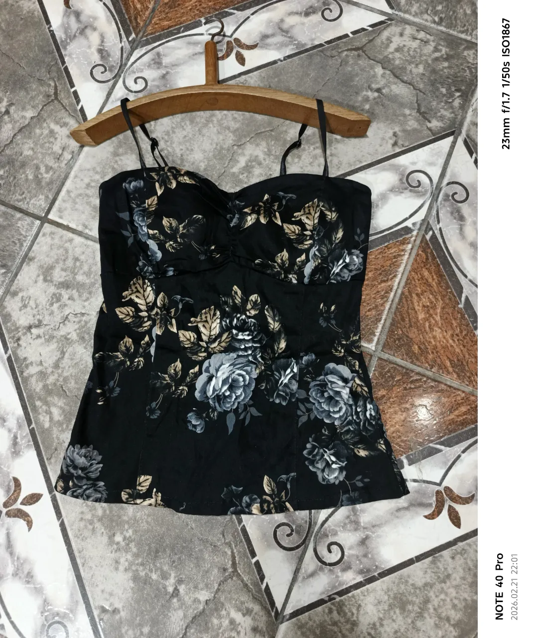 Top negro con estampado floral en tonos grises y dorados. Diseño con tirantes finos y escote corazón fruncido. Ideal para un look canchero y femenino.