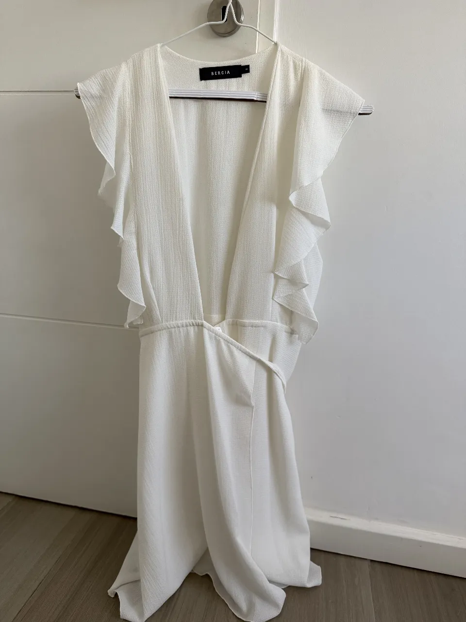 Vestido blanco de tela liviana con volados en las mangas y cinturón para atar. Ideal para un look fresco y elegante.