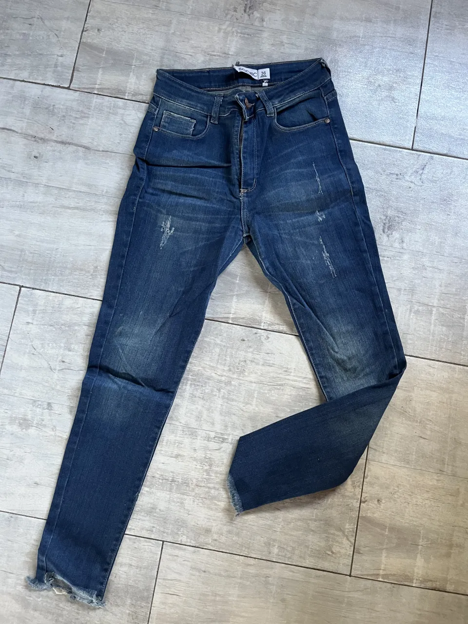 Jean azul con roturas y detalles desgastados en piernas y botamangas. Botamangas desflecadas.