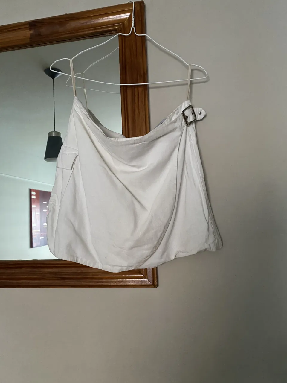 Pollera blanca con hebilla metálica en la cintura y bolsillo lateral con tapa.