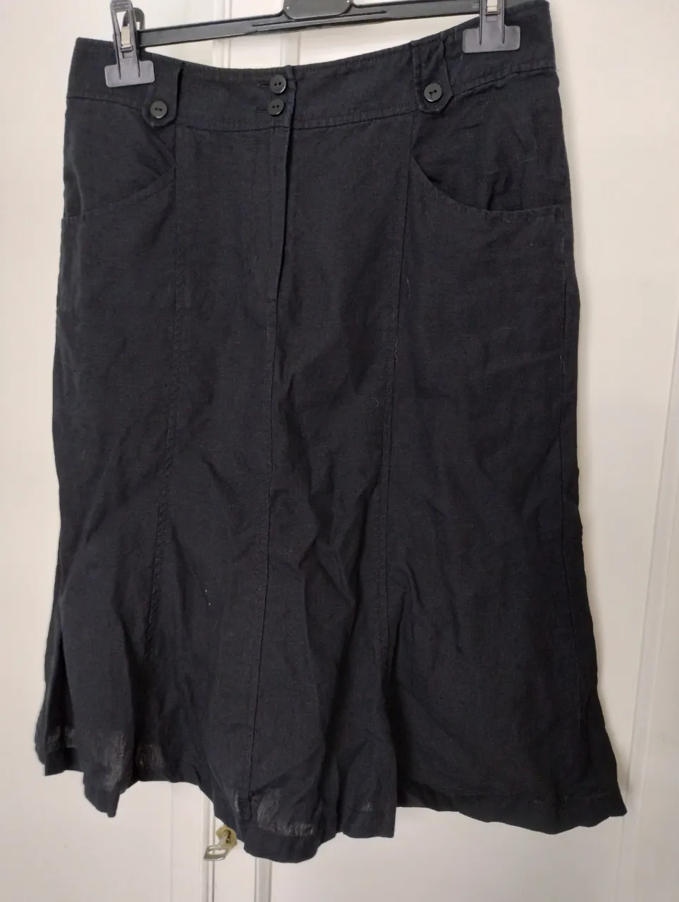 Pollera Cacharel negra de corte A, con bolsillos y detalles de botones en la cintura. Puro lino. Ideal para un look casual o de trabajo.