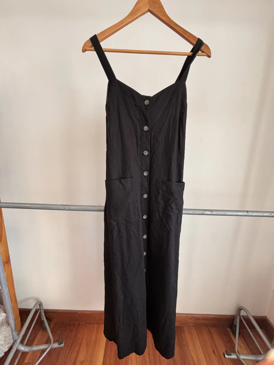 Vestido negro largo con breteles finos y botones al frente. Posee bolsillos laterales. Ideal para un look casual y cómodo.