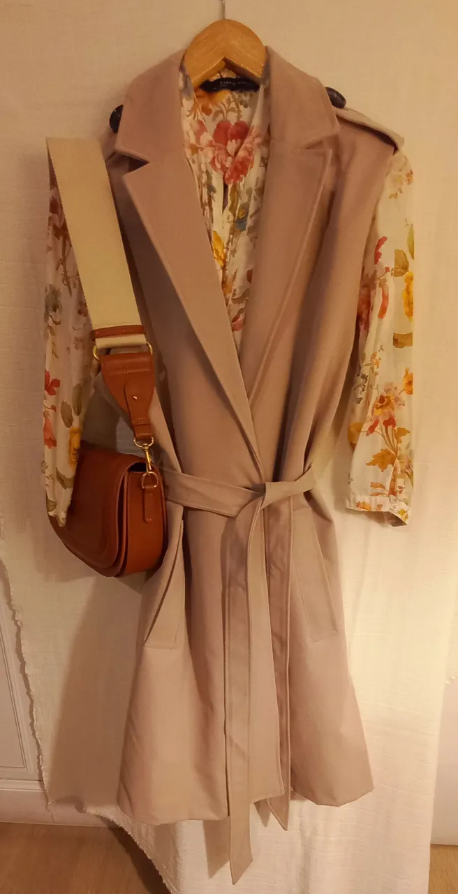 Chaleco trenchs impermeable largo color beige con cinturón de la misma tela. Forrado Cinto Bolsillos charreteras Nuevo sin etiqueta Talle 50 ( xl )