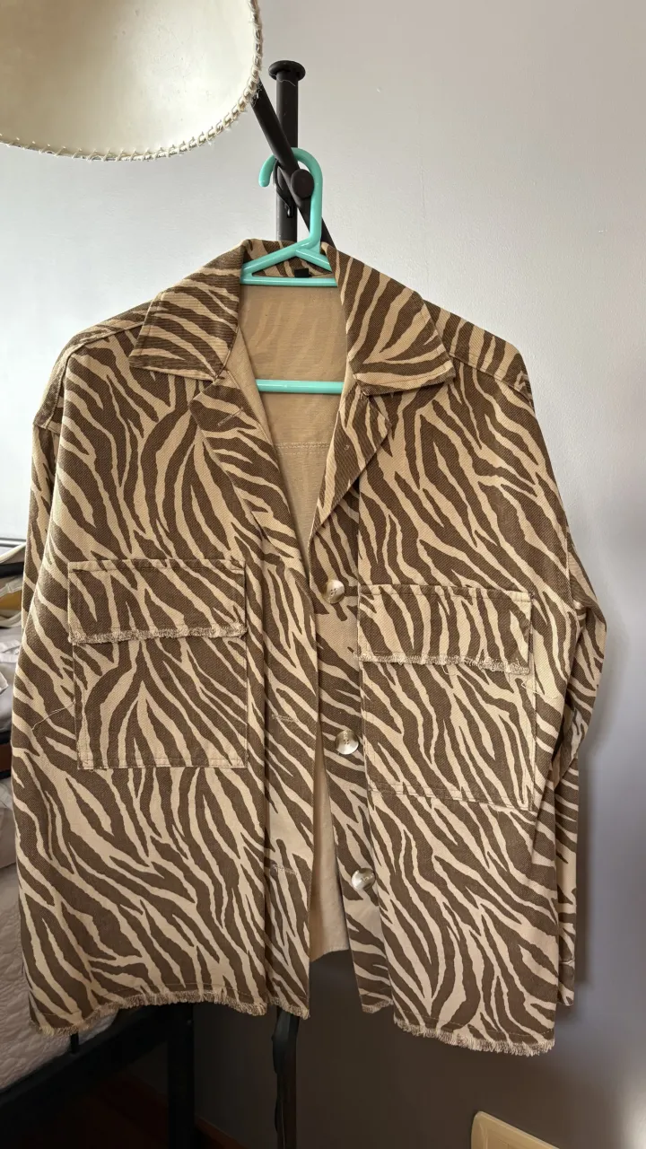 Campera con estampa de cebra, cuello solapa, dos bolsillos con tapa en el frente y botones.