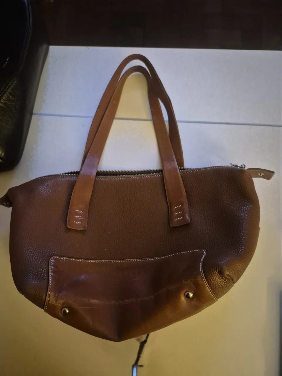 Bolso de cuero marrón Lazaro, súper práctico y canchero. Tiene un bolsillo exterior y cierre principal. Ideal para el día a día.