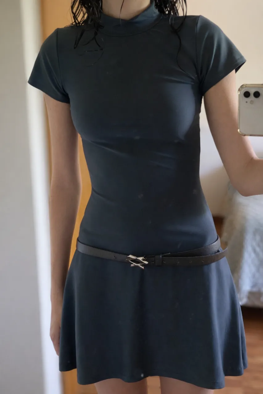 Vestido de cuello alto con mangas cortas y falda evasé. Ideal para un look casual y elegante, perfecto para el día o la noche. Combinalo con tus accesorios favoritos. Medidas: 33 cms de sisa, 29 cms de cintura, 50 cms de cadera, 78 cms de largo. La tela se estira