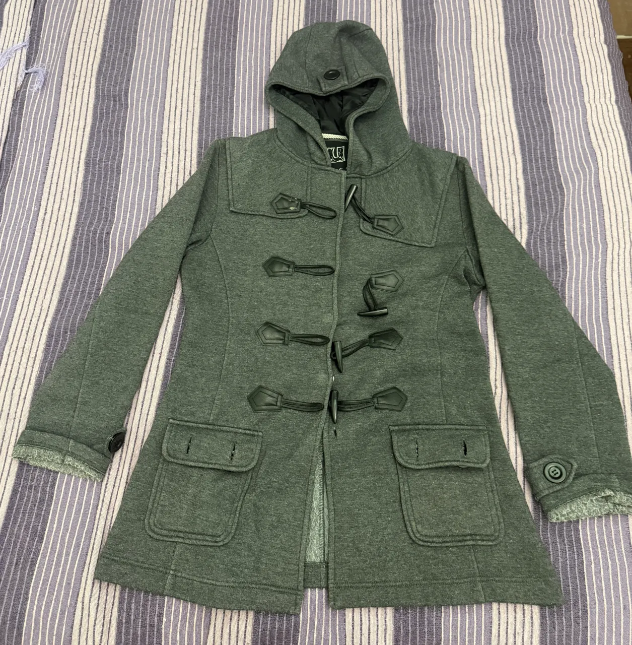 Abrigo estilo "duffle coat" con capucha, de paño gris. Posee detalles de eco cuero en los cierres y bolsillos. Ideal para un look casual y abrigado.