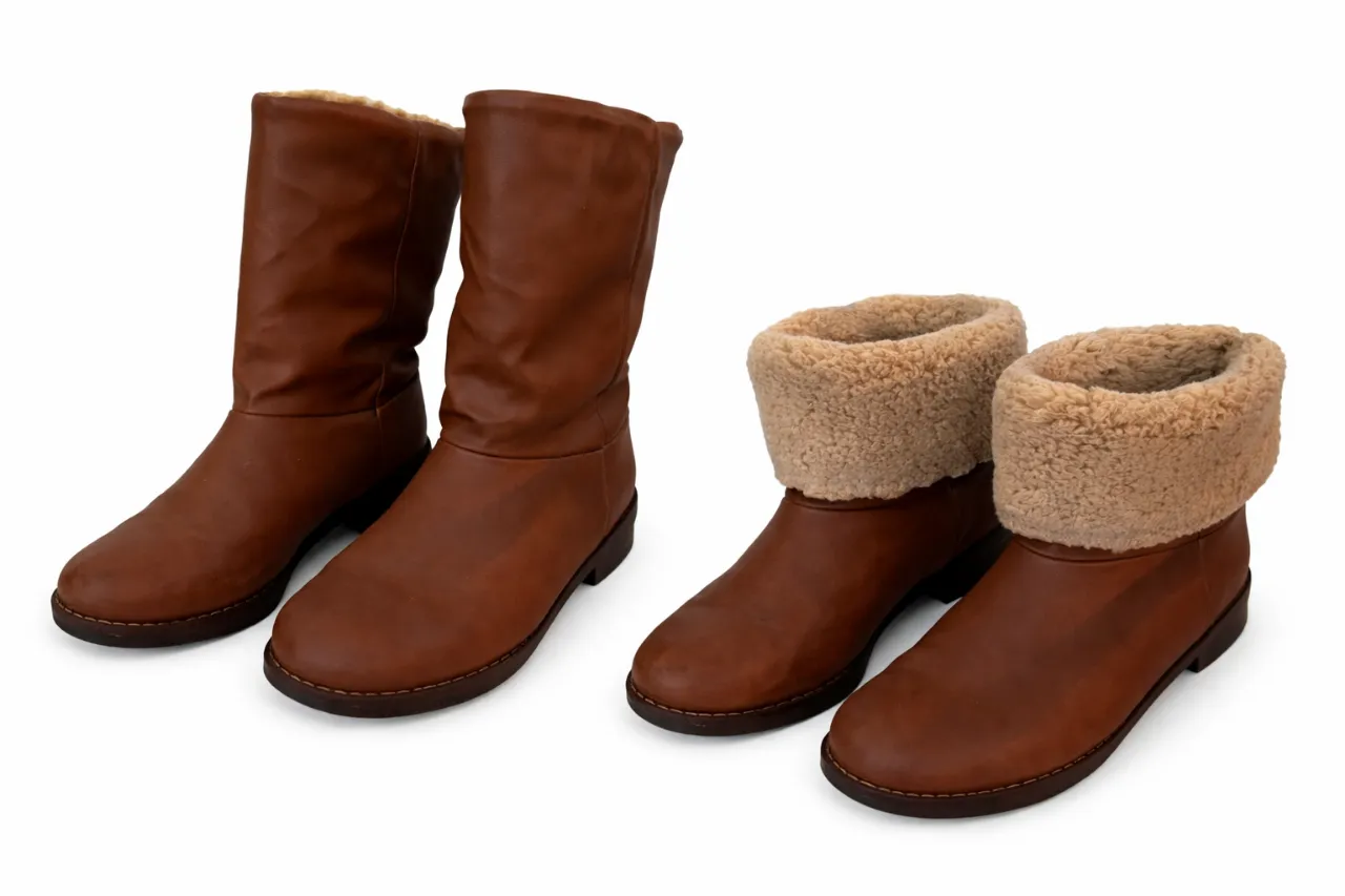 Botas de cuero marrón, un par de caña alta y otro par de caña baja con borde de piel sintética.