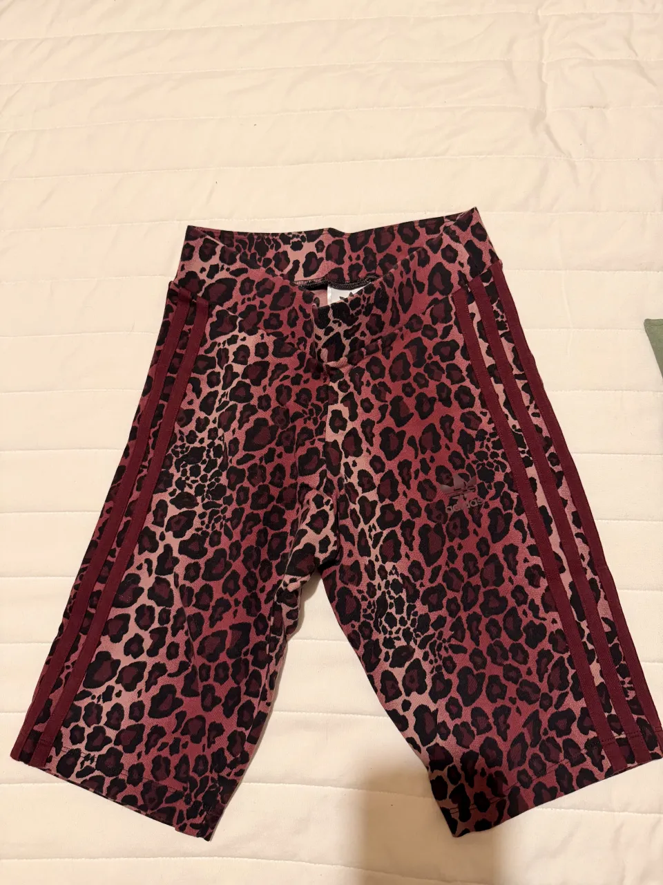 Calza de Adidas con estampa de leopardo en tonos rosas y bordó. Tienen las tres tiras clásicas de la marca en los laterales. Sin etiqueta, no tiene uso.