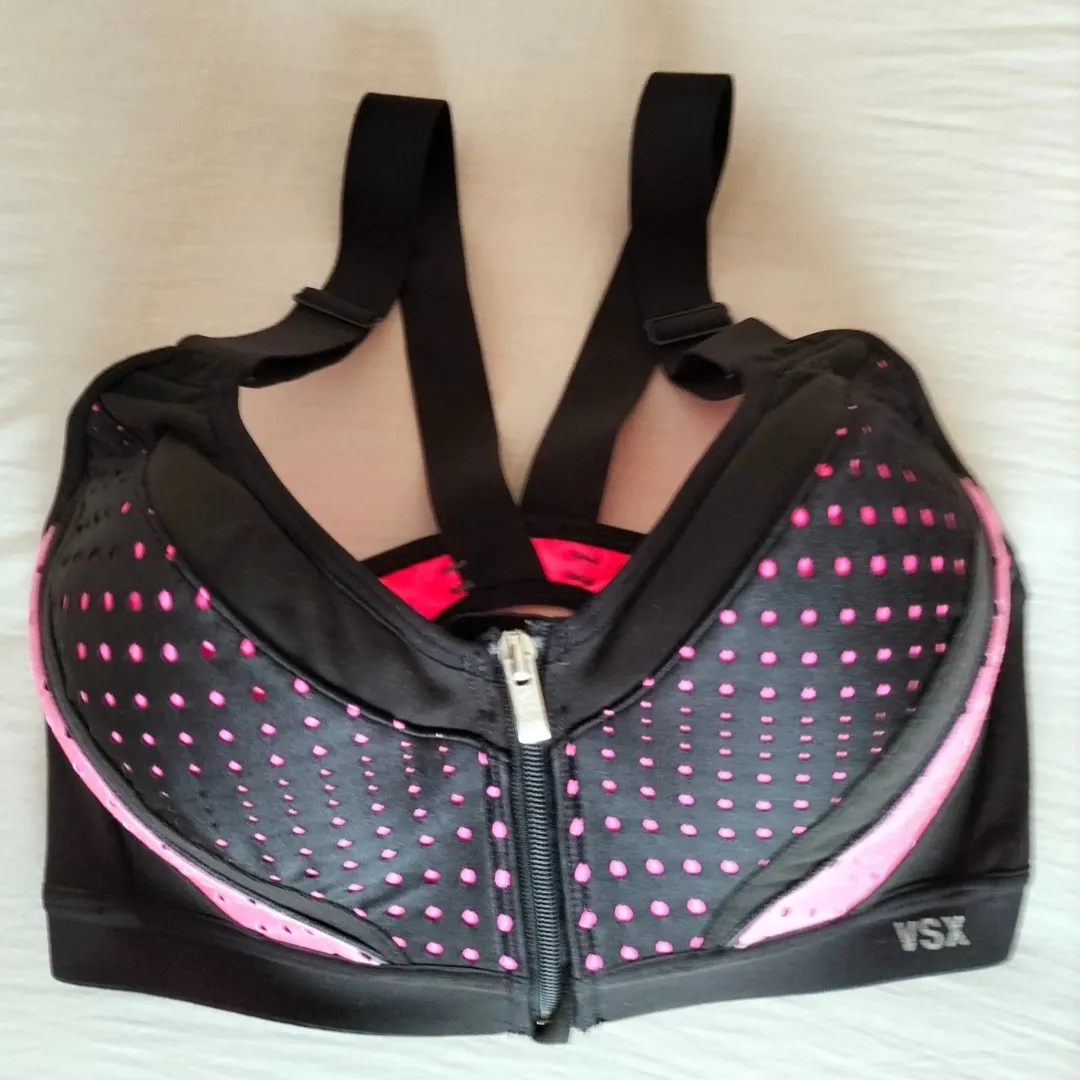 Top deportivo Victoria 's Secret Sport. Negro con detalles en fucsia. Posee cierre frontal y tiras cruzadas en la espalda. Sin uso. Elásticos y Lycra impecable. Talle 32C . Cualquier duda consultame.