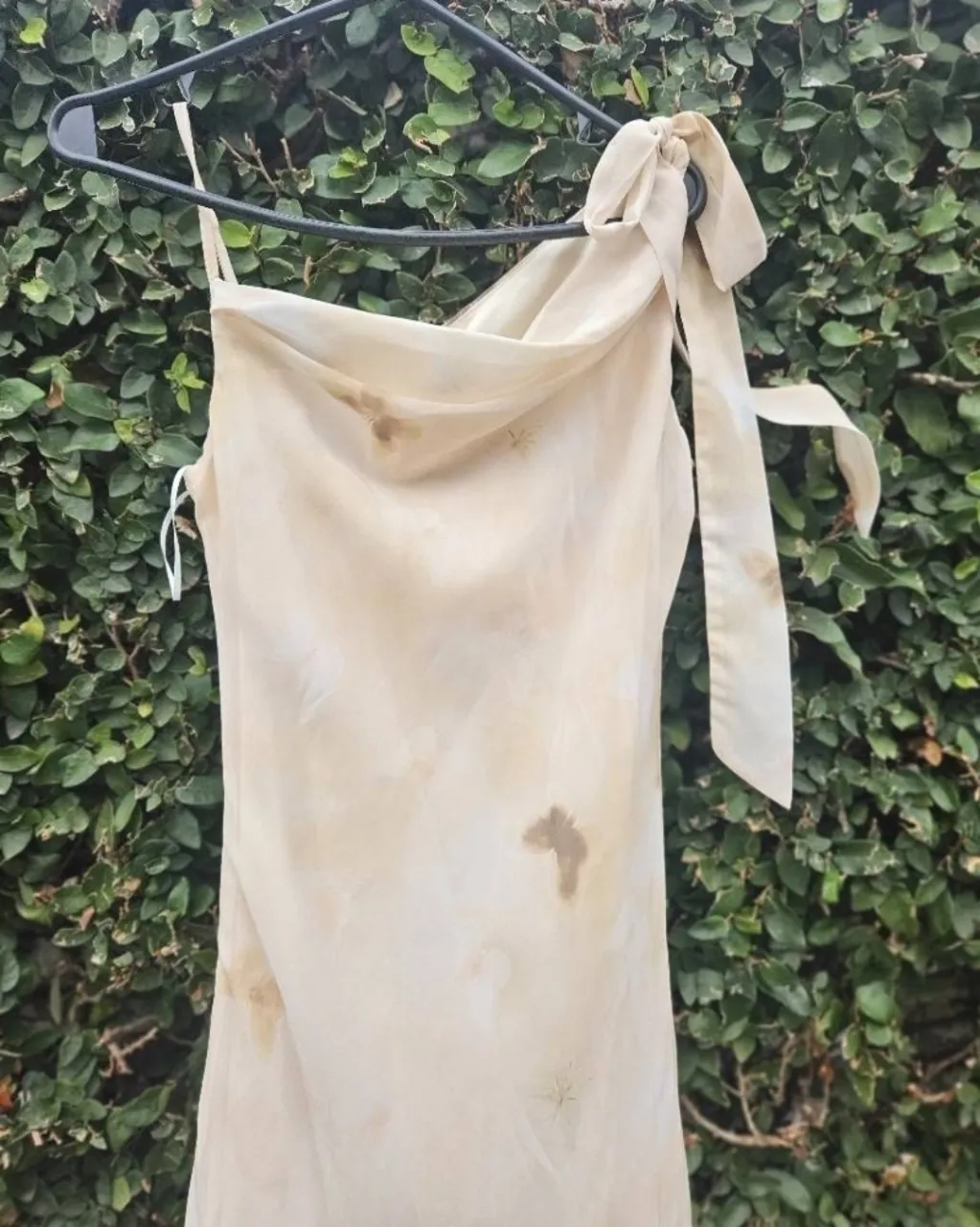 Vestido largo con estampado de mariposas sutil. Diseño con tiras finas y lazo que se ata en el hombro. Ideal para eventos de verano o una salida elegante. nuevo sin uso.