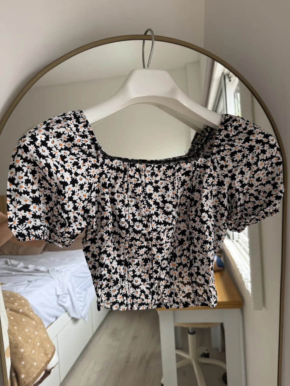 Top corto estampado floral de fibrana con mangas abullonadas y escote cuadrado. Ideal para un look fresco y femenino. medidas: largo 28 axila a axila 39cm