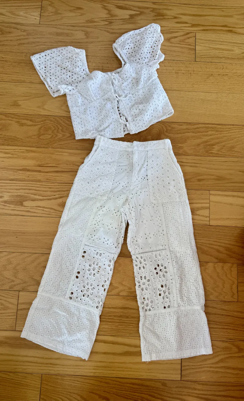 Conjunto blanco de top y pantalón de broderie blanco. El top es corto, con mangas cortas acampanadas y escote cuadrado. El pantalón es ancho, con cintura alta y detalles de broderie en toda la prenda. Talle 10 pero sugerido para 8 años ya que la tela no cede