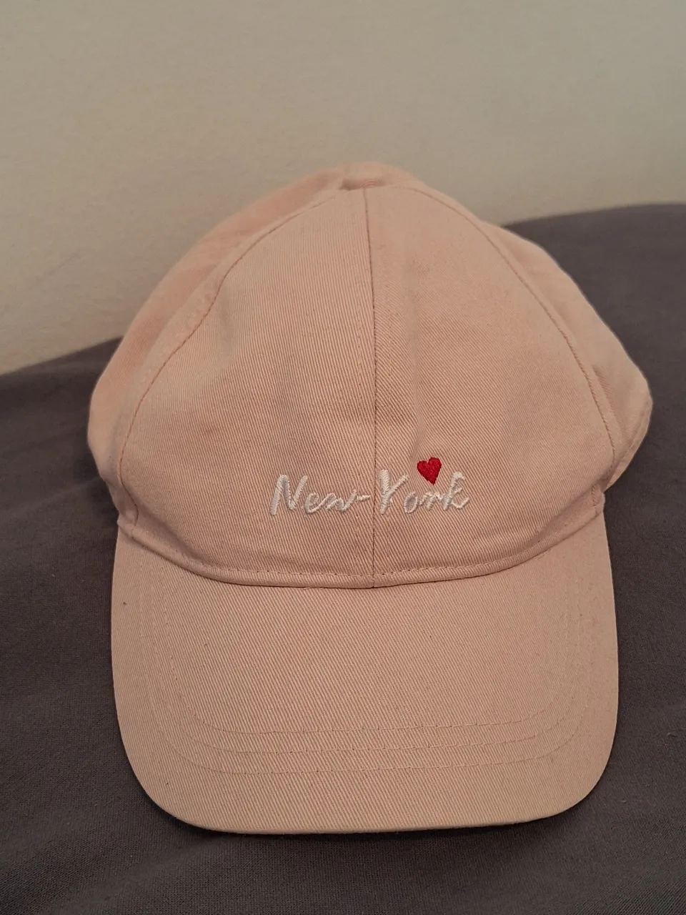 Gorra de algodón H&M color rosa pálido con bordado "New York" y un corazón rojo. Ajustable en la parte trasera.