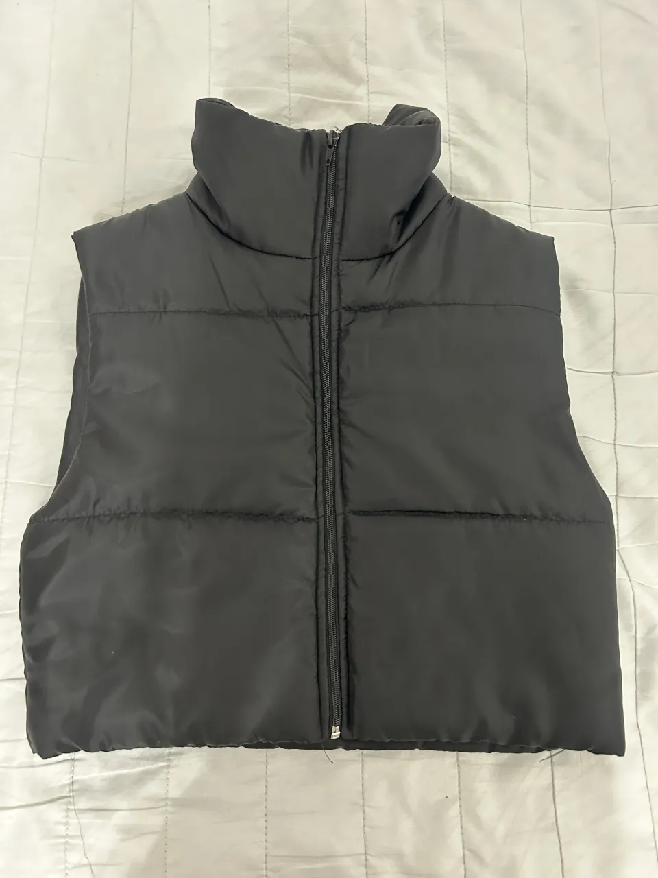 Chaleco acolchado negro con cuello alto. Ideal para un look urbano y moderno, perfecto para las épocas de entretiempo o para complementar outfits en días frescos. Su diseño liso y versátil lo hace fácil de combinar.