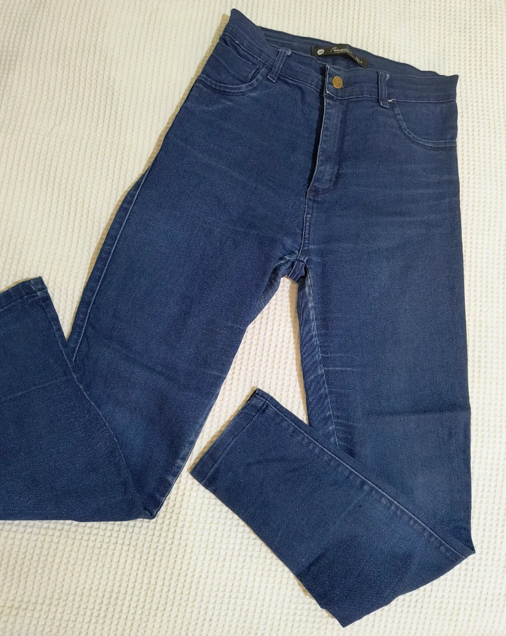 Jean elastizado tiro alto color azul oscuro. Corte chupín.