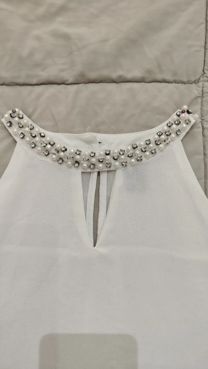 Top blanco con cuello adornado con perlas y strass. Diseño moderno y elegante, ideal para lucir sofisticada en cualquier ocasión. 47,5 CM ancho 69 CM largo Cuello 18CM