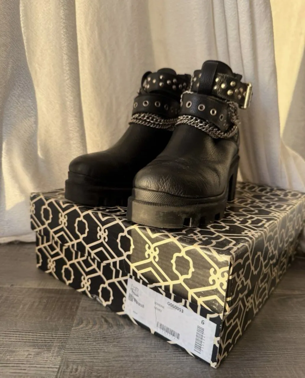 Borcegos negros con cadenas y tachas. Cierre en la parte trasera. Cuero vacuno perfecto estado