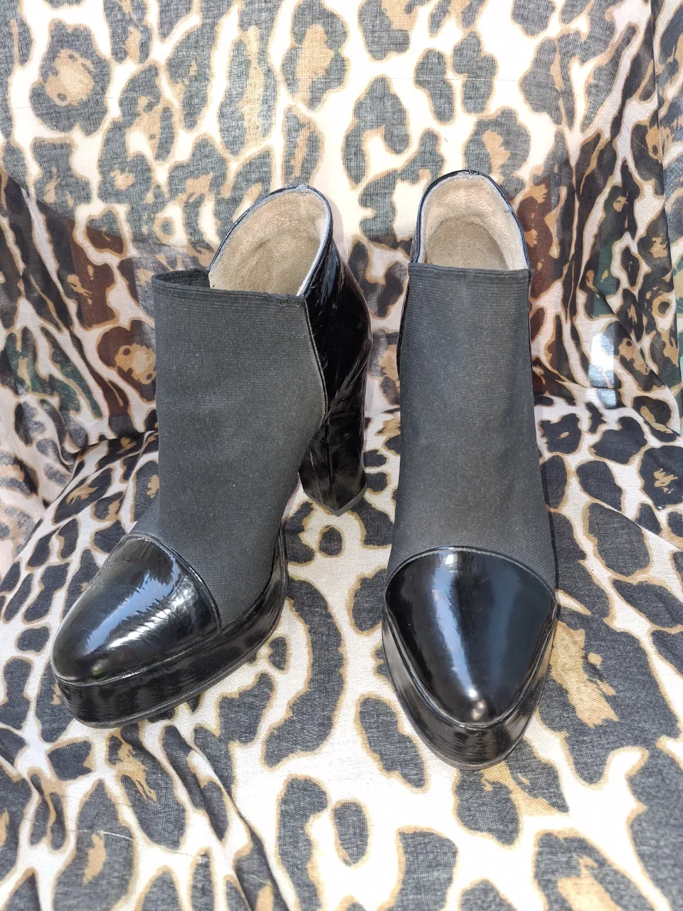 Botitas negras con taco y plataforma. Combinan material símil charol en la punta y el talón con tela.
