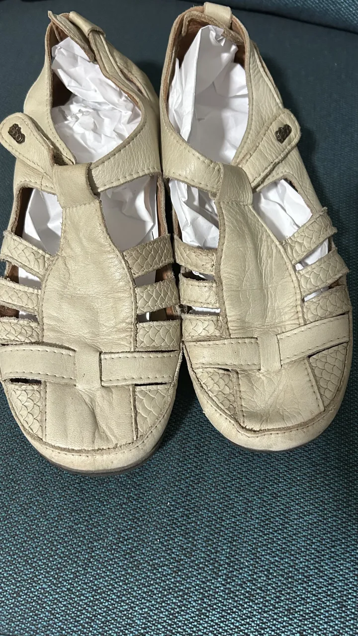 Sandalias bajas de cuero color crudo. Tienen tiras cruzadas. Son súper cómodas