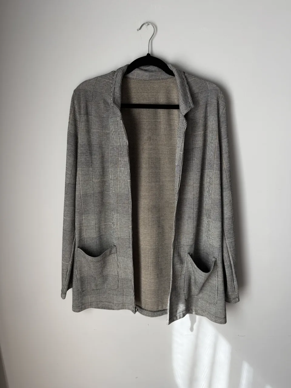 Blazer a cuadros grises y blancos con cuello mao y dos bolsillos delanteros.