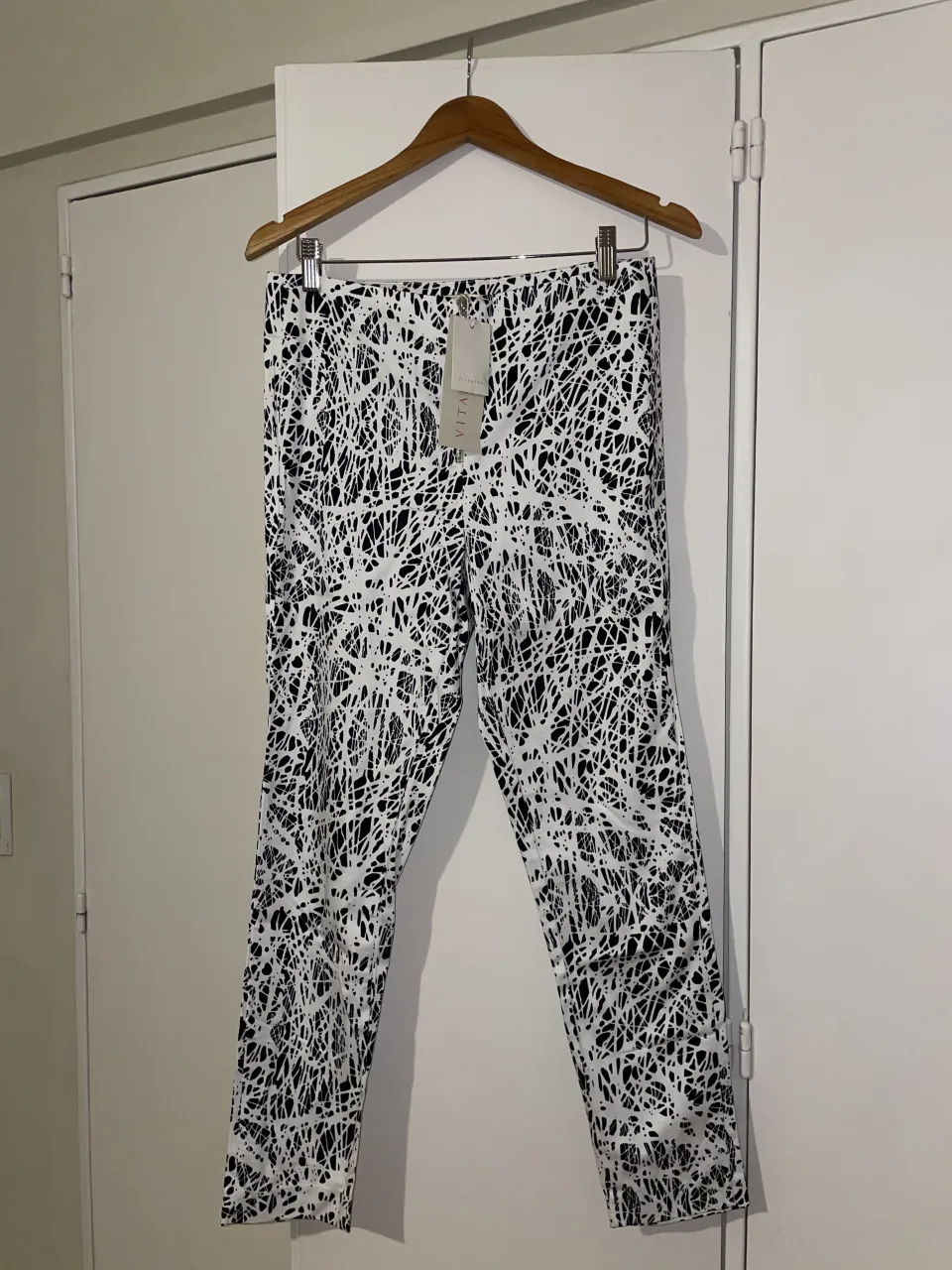 Calzas estampadas en blanco y negro con cierre metálico en la parte delantera. Talle 40-42. Contorno cintura: 64cm , contorno cadera: 90cm.