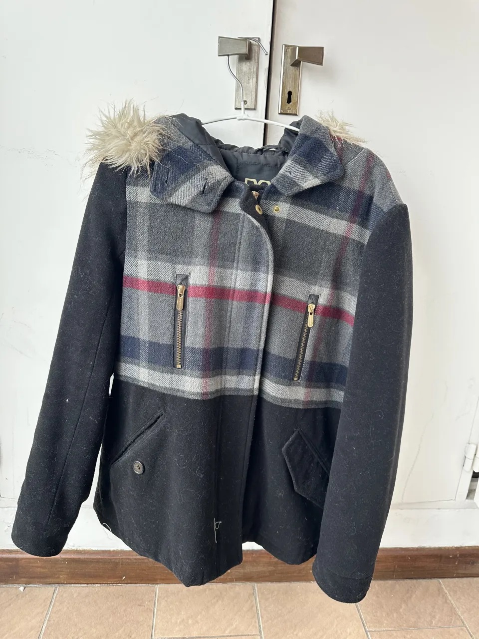 Campera con capucha forrada en piel sintética. Posee cuello escocés con solapa y cierre. Dos bolsillos frontales con cierre y un bolsillo interno. Puños y parte inferior de la campera en tela negra lisa.