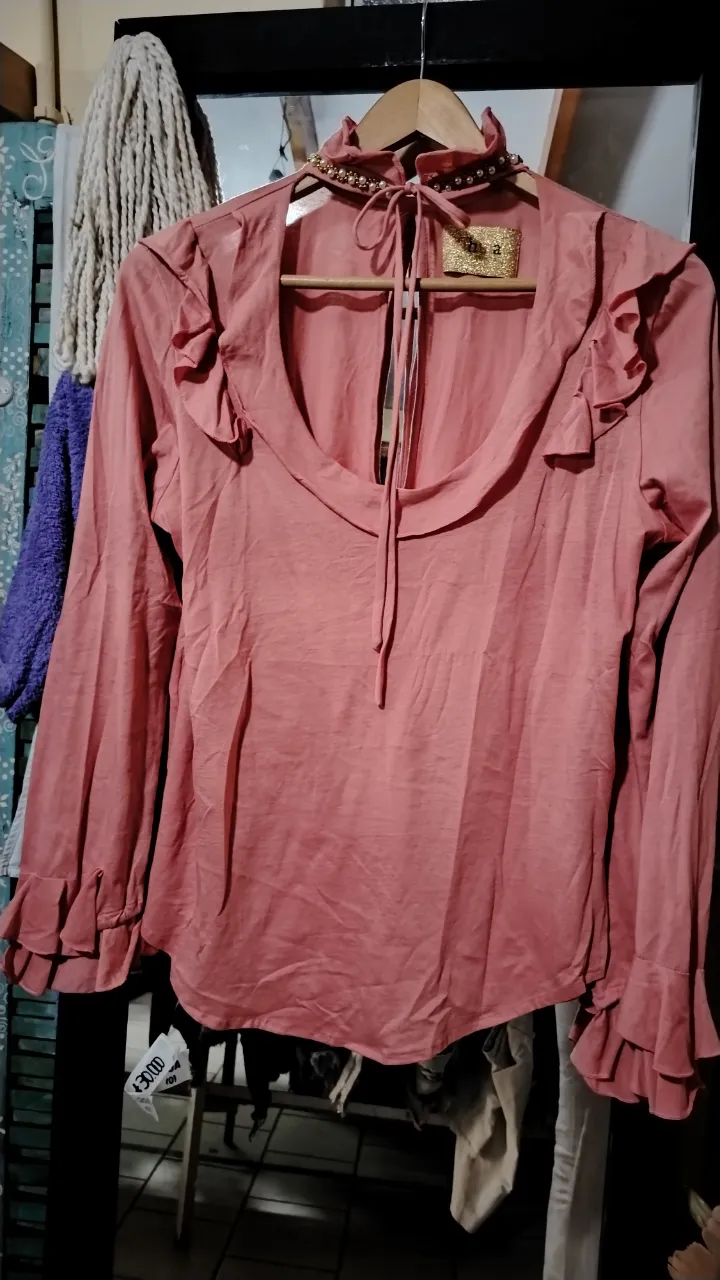 Blusa manga larga color rosa con volados en cuello y puños. Detalle de perlas y tachas en el cuello. La marca es "China by Natalia Antolín". Medidas : 40cm de hombro a hombro, 53cm de axila axila, 25cm ancho de manga, 63cm largo manga, 66cm largo total