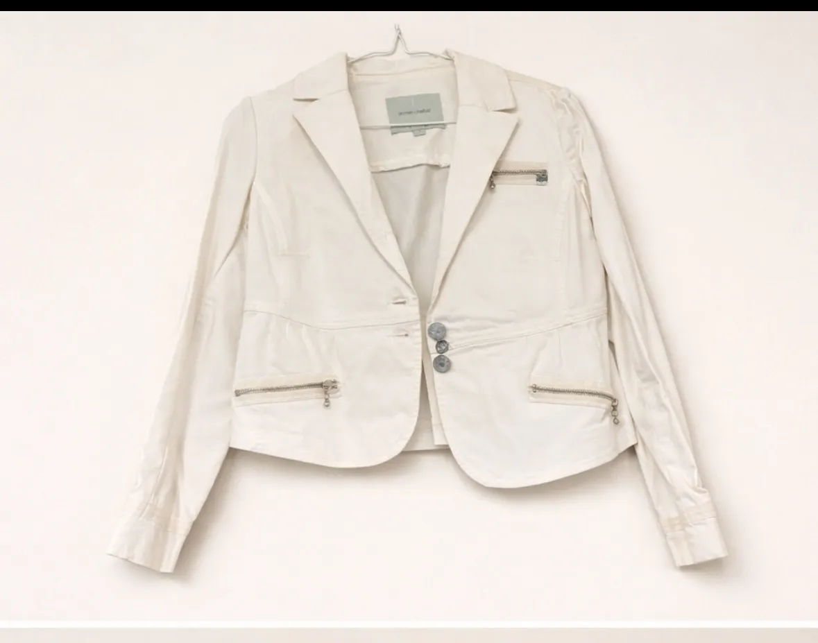 Blazer blanco de corte entallado, ideal para un look elegante y moderno. Cuenta con detalles de cierres plateados en los bolsillos frontales y un botón principal. Perfecto para elevar cualquier atuendo.