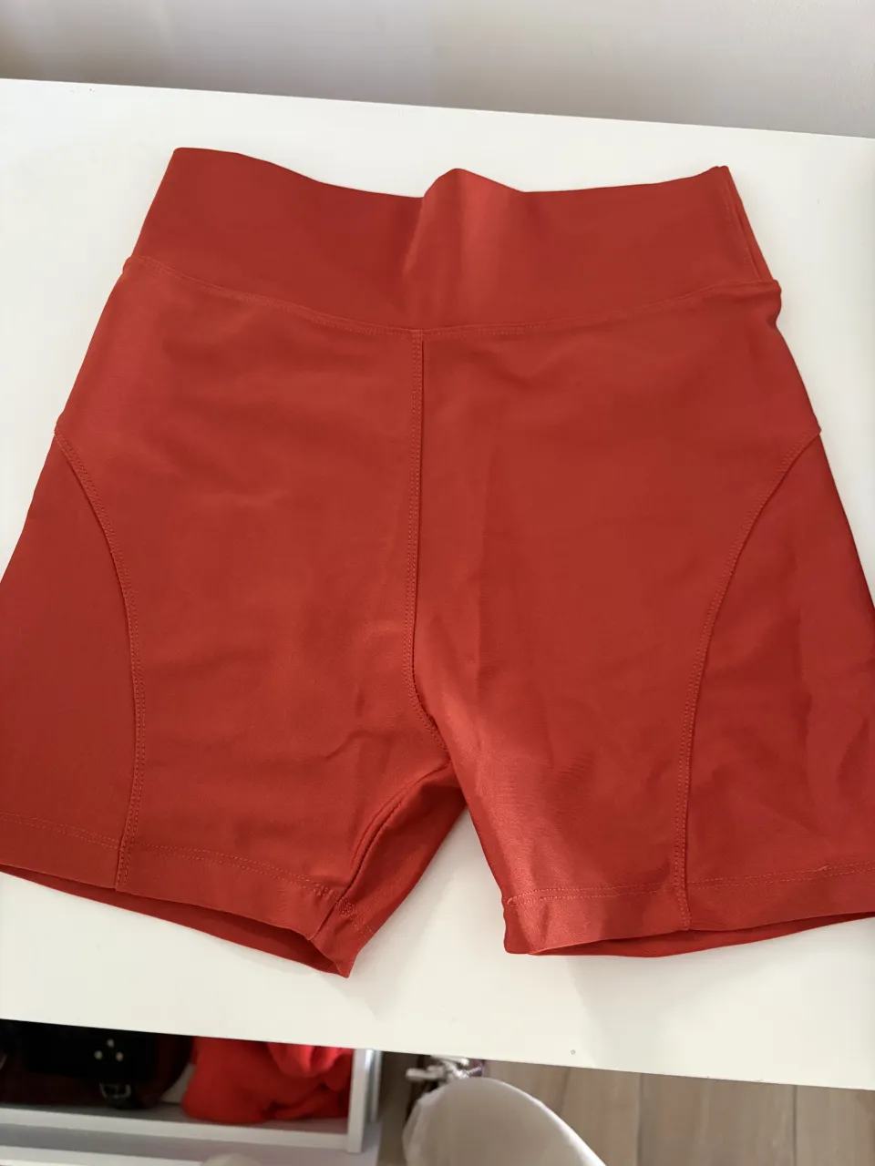 Shorts deportivos de color rojo ladrillo. Tienen costuras reforzadas en los laterales y en la parte trasera.