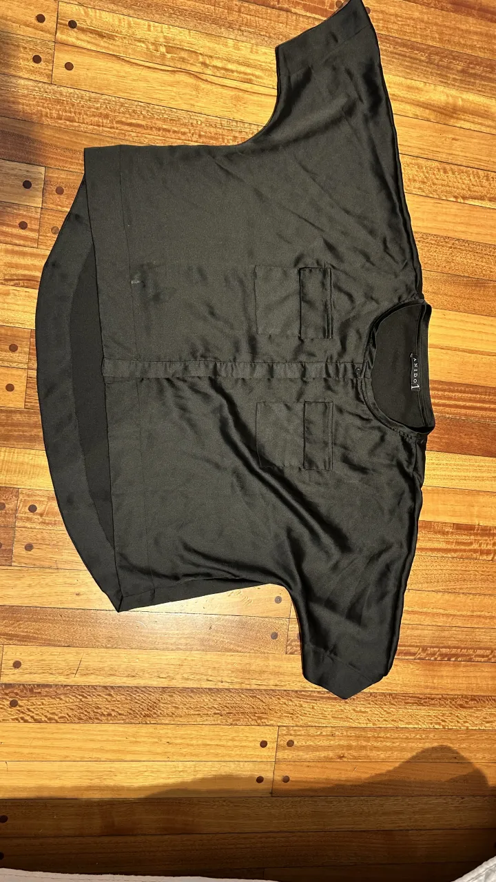 Remera negra de seda con bolsillos y botones al frente. Diseño moderno y elegante, ideal para cualquier ocasión.
