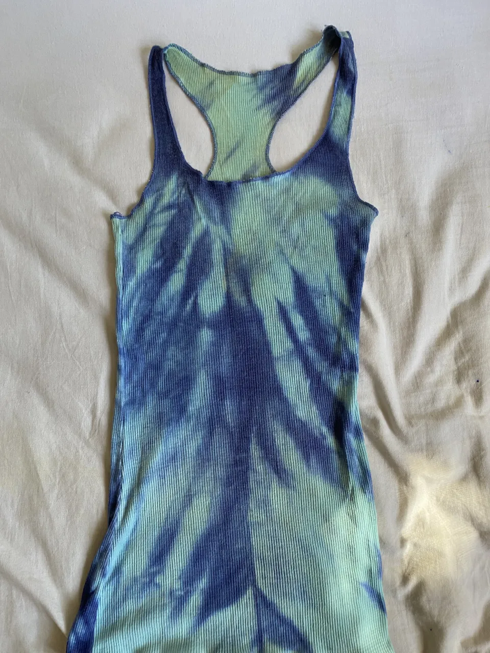 Musculosa de morley con estampa tie dye en tonos de azul y verde.