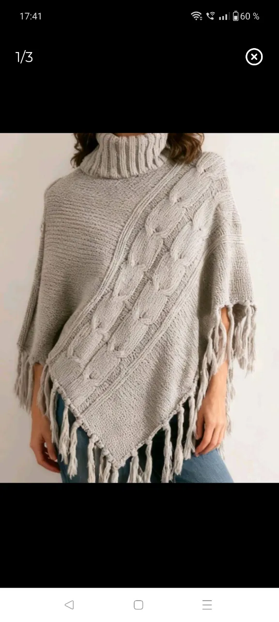 Poncho de lana sintética gris con cuello alto y detalles de trenzas en diagonal. Posee flecos largos en el borde inferior.
