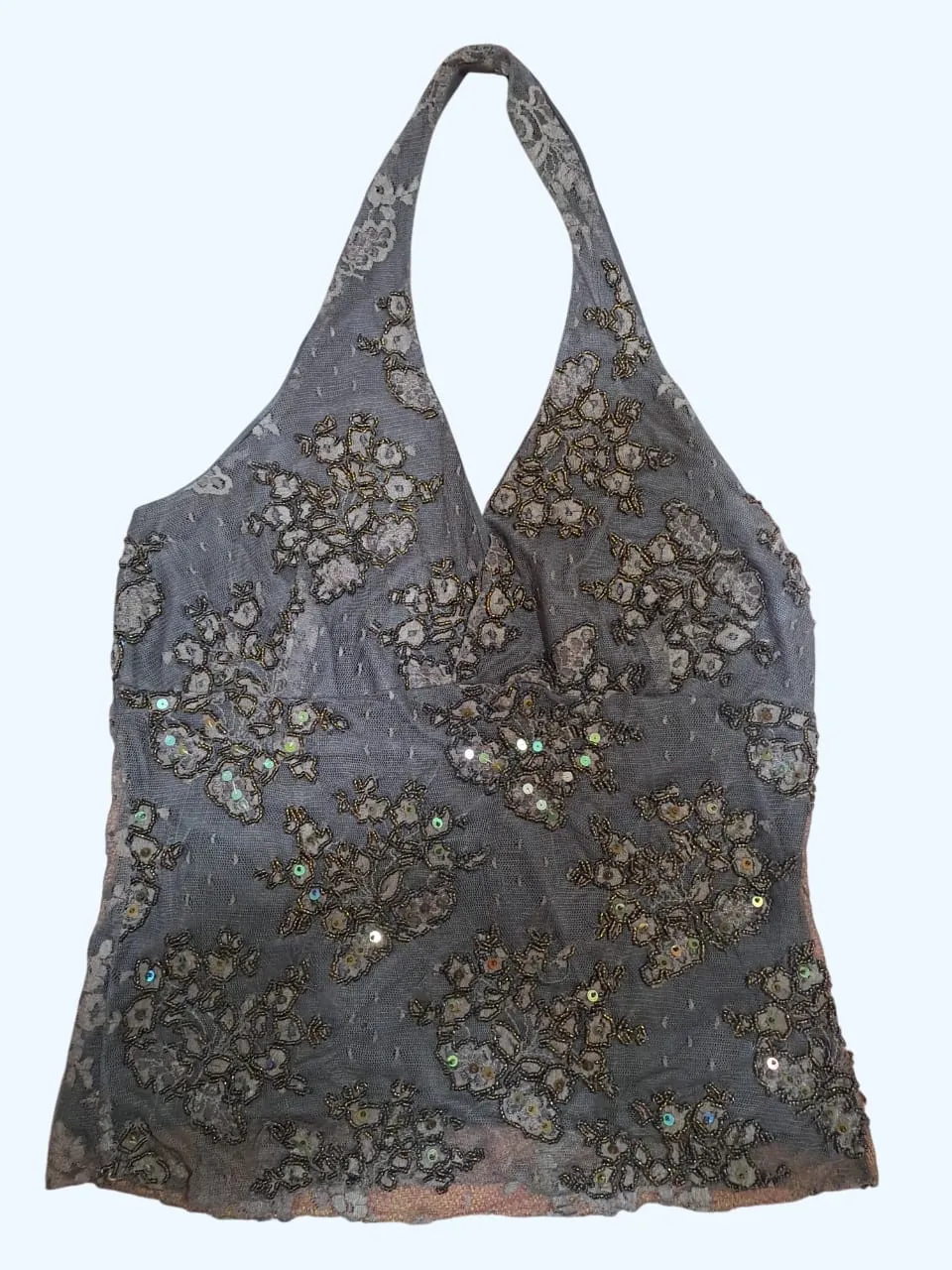 Top halter con detalles de encaje y lentejuelas, ideal para un look canchero y femenino. Perfecto para salidas nocturnas o eventos especiales.