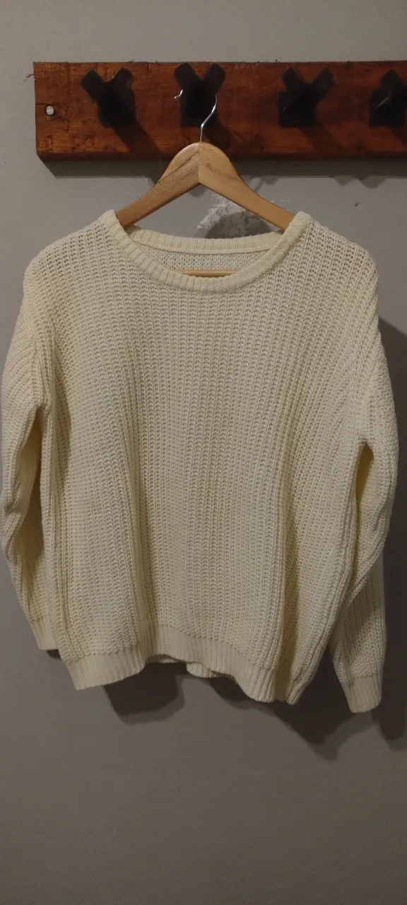Sweater tejido de color crudo con cuello redondo y mangas largas.