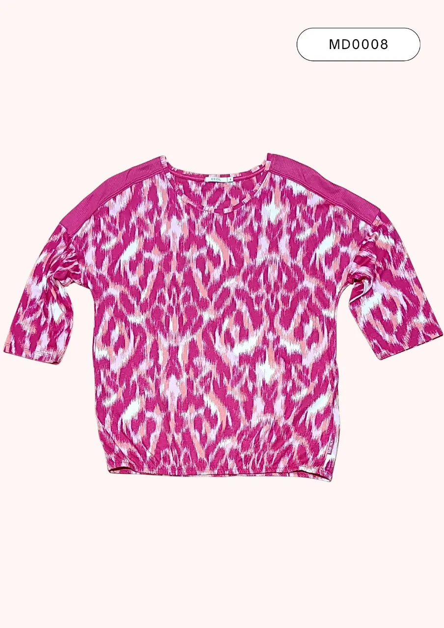 Remera manga 3/4 con estampa vibrante en tonos fucsia, rosa y blanco. Posee detalles de tejido acanalado en los hombros y cintura elastizada para un ajuste cómodo. Ideal para un look casual y moderno. Medidas: (2) 52 cm (5) 62 cm